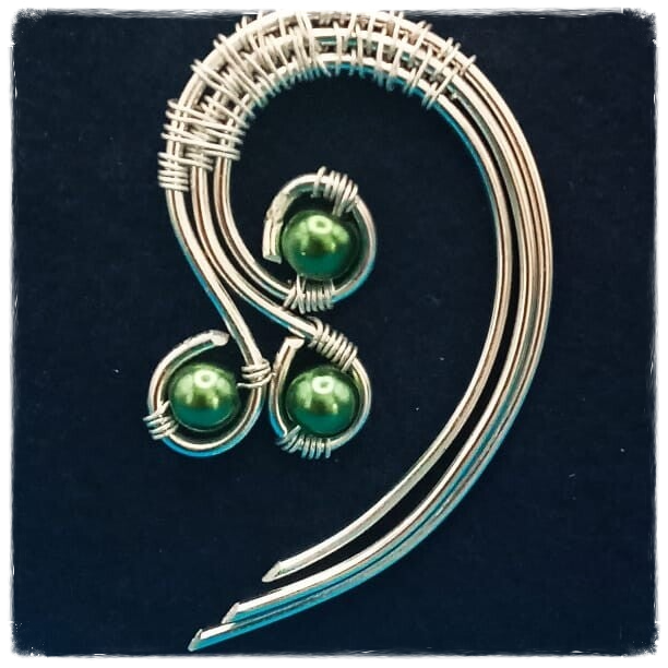 Très élégant ce pendentif en fil d'aluminium de couleur argent, agrémenté de trois perles d'un joli vert irisé
