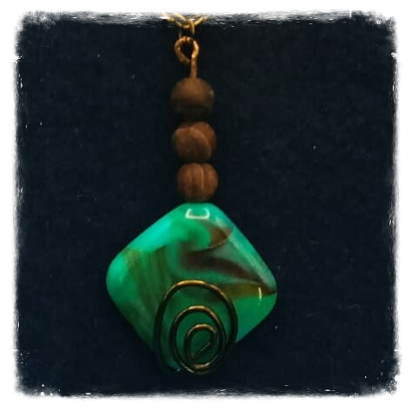 Une torsade de fil de cuivre bronze et des agates tibetaines agrémentent cette perle carrée d'un joli vert