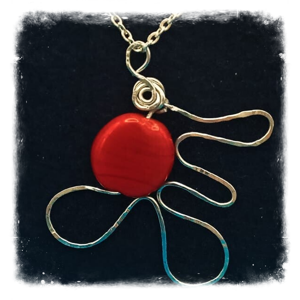 Des arabesques en fil martelé pour entourer cette perle plate d'un rouge vif.