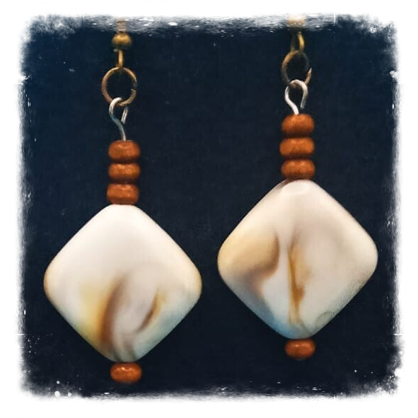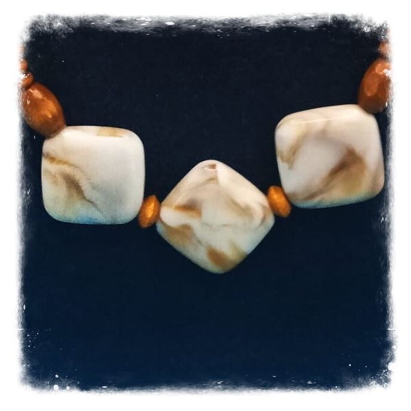 Des perles de bois conjuguées aux perles carrées joliment marbrées donnent à cette parure composée d'un collier et de boucles d'oreilles un petit côté vintage très séduisant