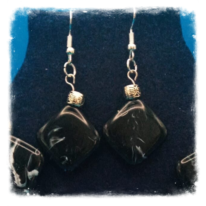 Une perle métallique et des perles carrées noires accrochées à un cordon pour cette parure composée d'un collier et de boucles doreilles