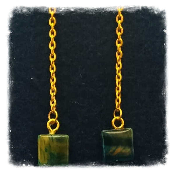 Des perles carrées bleu vert réunies par une chaîne dorée pour cette parure composée d'un collier et de pendants d'oreilles