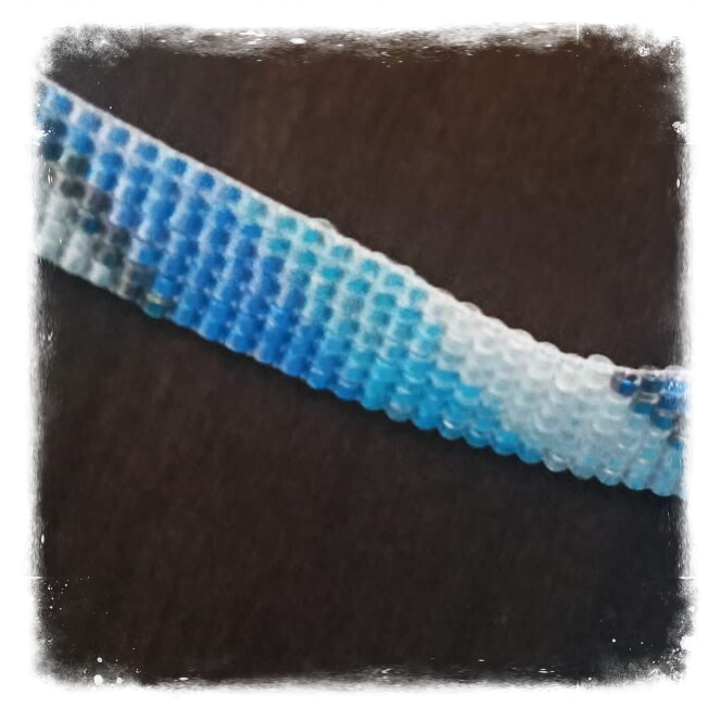 Un dégradé de bleu, du noir et du blanc pour ce tissage sur sept rangs. Fermoir argenté.