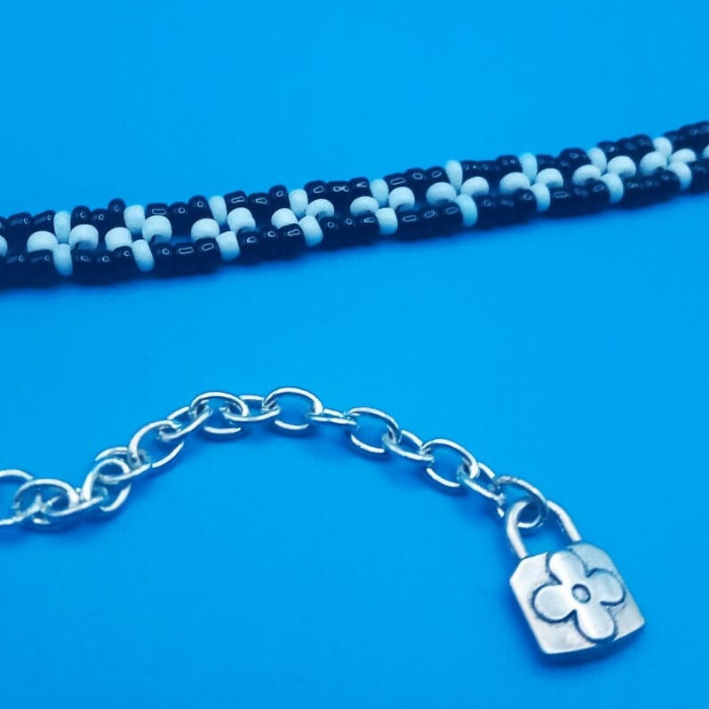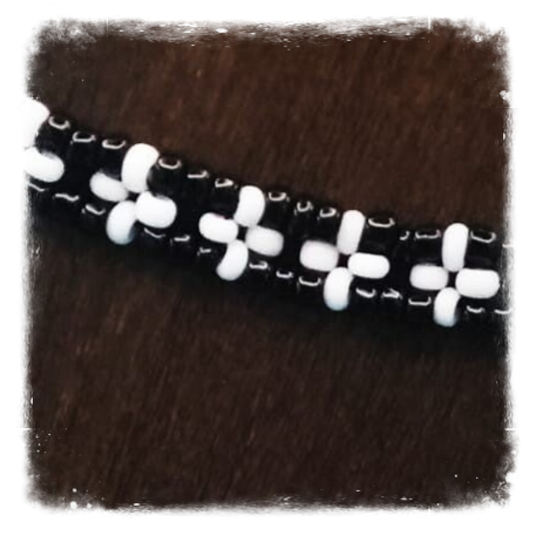 Motif fleurs pour ce tissage en noir et blanc. Breloque et fermoir argentés