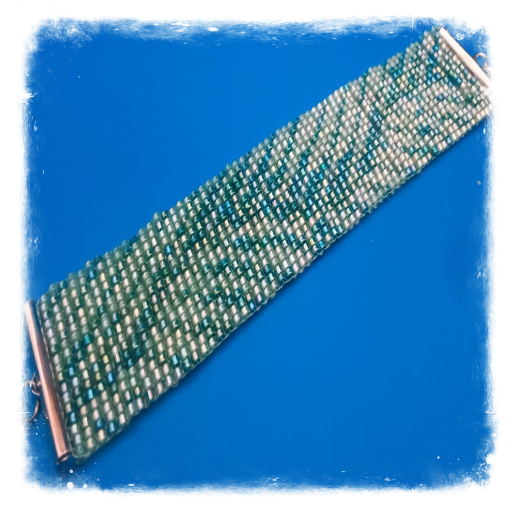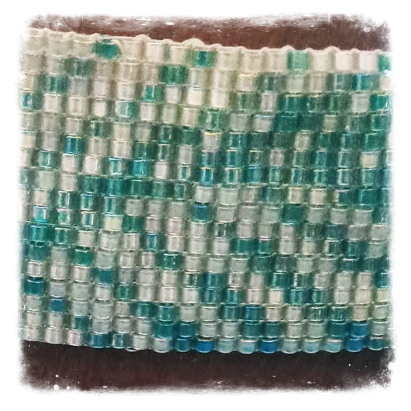 Format manchette pour ce tissage blanc et vert sur dix sept rangs. Fermoir argenté