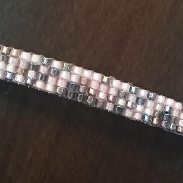 Couleur argent et rose pour ces perles tissées sur quatre rangs. Fermoir argenté
