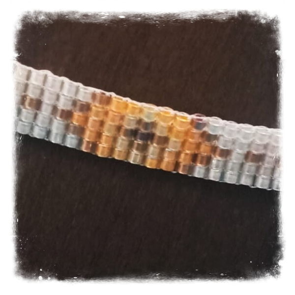 Motif orangé pour ces perles tissées sur cinq rangs. Fermoir doré