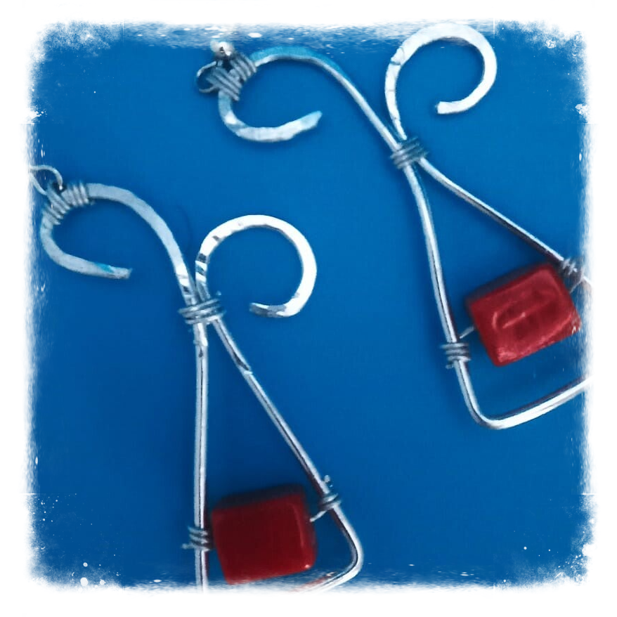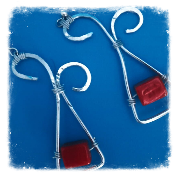 Des perles cube rouge vif et du fil martelé pour ces pendants d'oreilles qui pourront s'associer à nombre de vos tenues